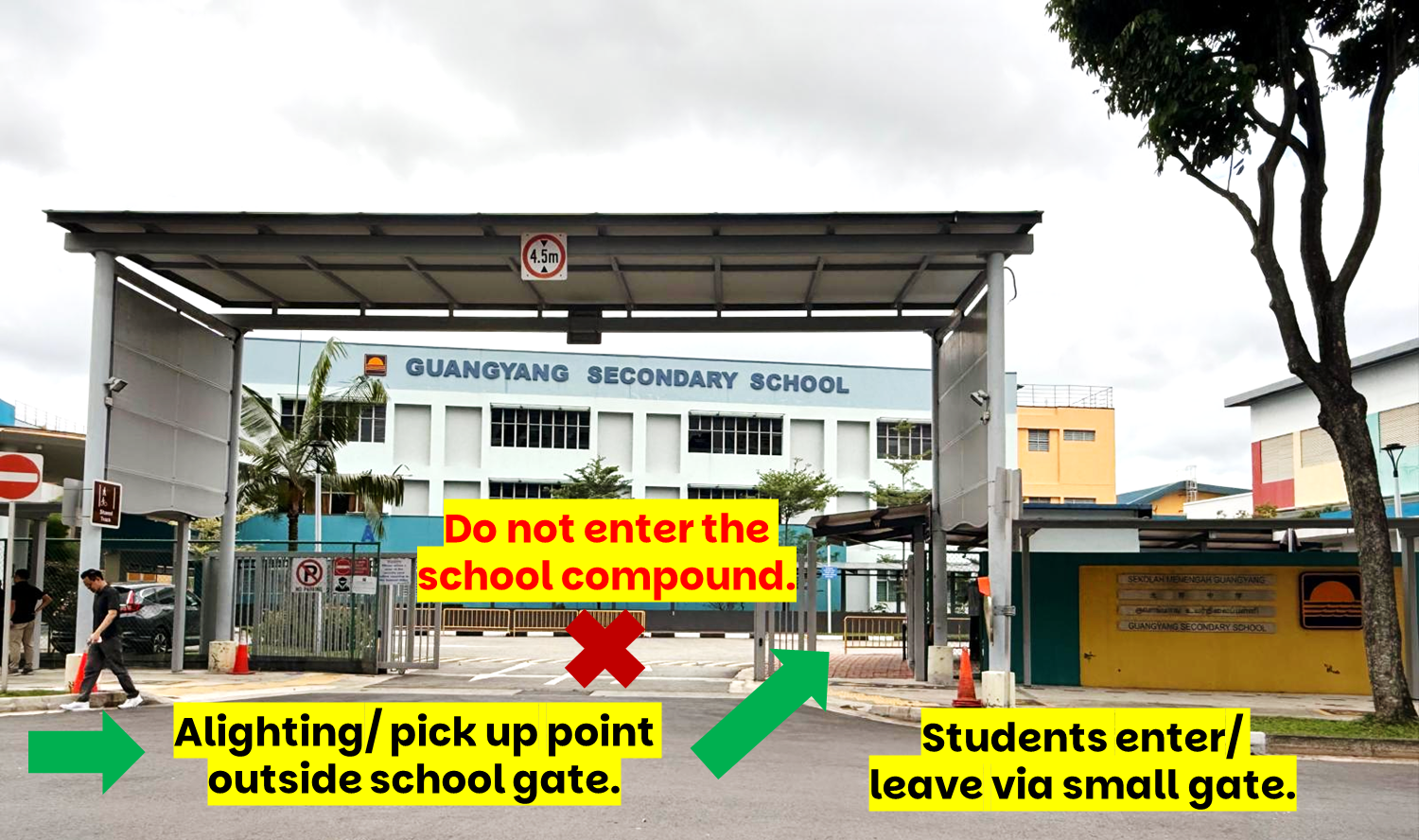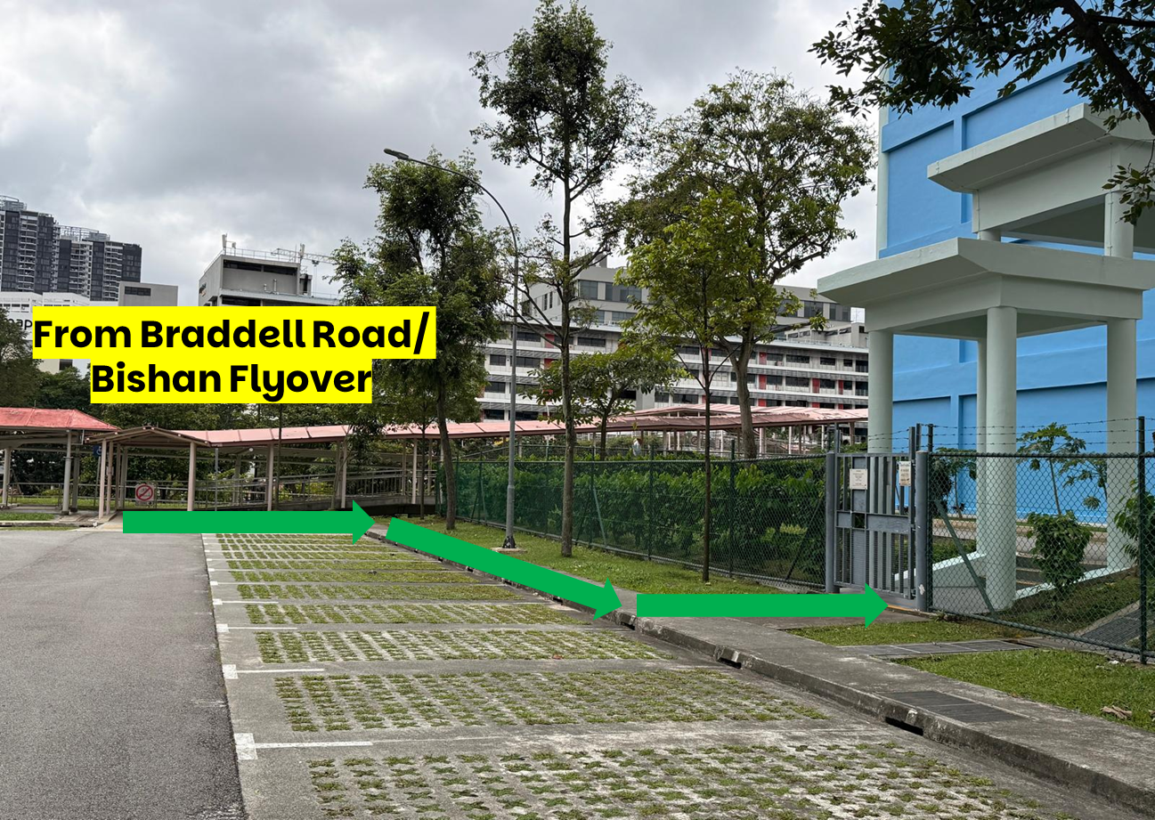 Students arriving from Braddell Road/ Bishan flyover should use the designated side gate into the school compound. Please note that this route includes an uncovered walkway.