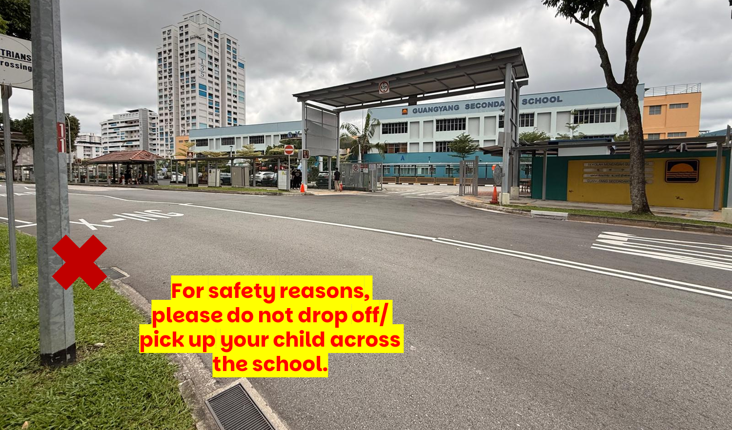 For safety, please refrain from dropping off/ picking up your child/ ward on the opposite side of the road.
