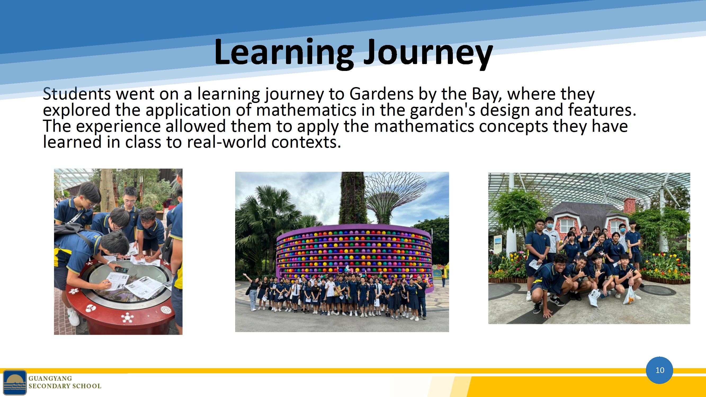 Our Mathematics Department is committed to nurturing confident problem-solvers who appreciate the beauty and relevance of mathematics in everyday life. Through our comprehensive approach, we develop students' Critical, Analytical, and Innovative Thinking (CAIT) while strengthening their mathematical reasoning and computational skills, cultivating the school's core values of Respect, Responsibility, Integrity, Care, and Grit. Our distinctive teaching methodology combines rigorous academic training with authentic learning experiences, ensuring every student discovers their mathematical potential. From talent development programs to hands-on learning journeys connecting classroom concepts to real-world contexts, we foster mathematical thinking as a powerful tool for understanding the world.